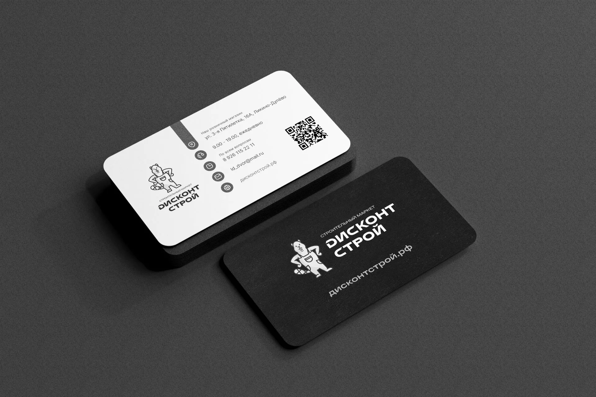 Вместе с логотипом, мы предложили заказчику сразу визуализацию логотипа в возможном дизайне на фирменный визитках магазина «Дисконт Строй» в Волжском.